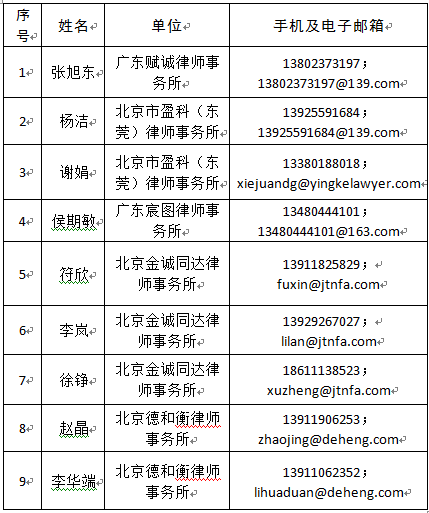 疫情期间,企业可以通过商协会或镇街商务部门反映问题,市商务局将征求相关律师意见后给予回复。企业也可以根据律师团各位律师擅长的领域,通过电话、微信、邮箱等在线渠道直接联系律师,获取法律支持。东莞市涉外律师服务团联系方式如下: